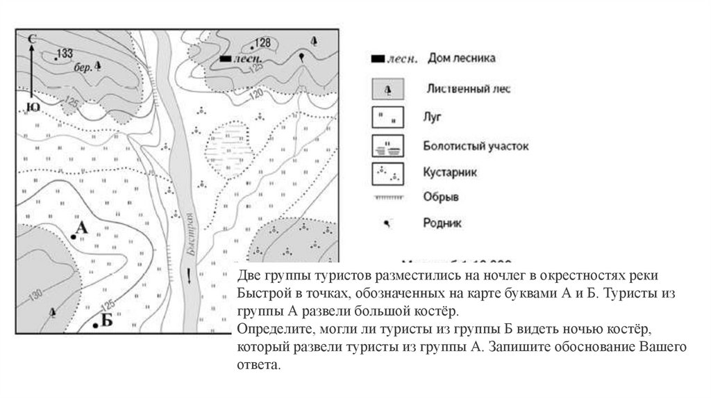 Две группы туристов разместились на ночлег в окрестностях рекиБыстрой в точках, обозначенных на карте буквами А и Б. Туристы из