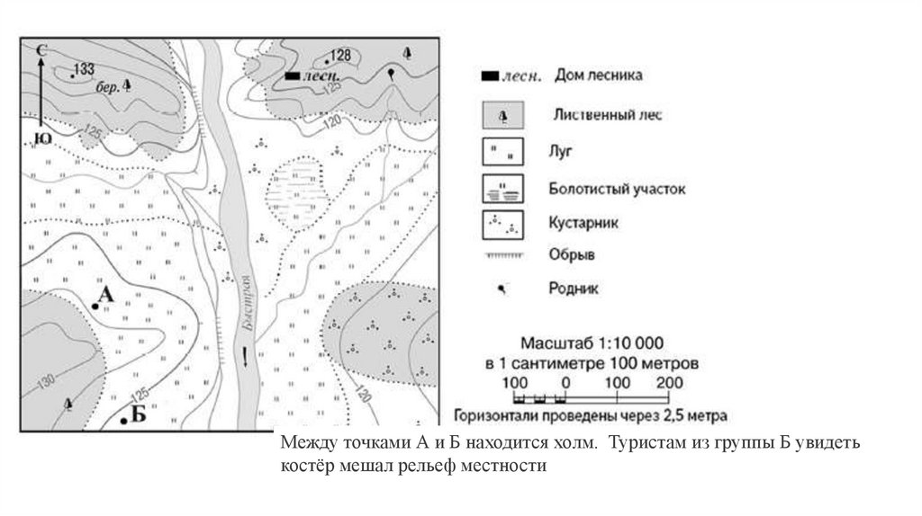 Между точками А и Б находится холм. Туристам из группы Б увидетькостёр мешал рельеф местности