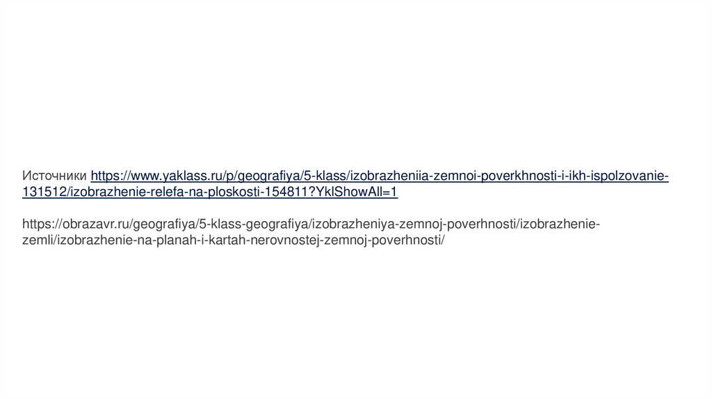 Источники https://www.yaklass.ru/p/geografiya/5-klass/izobrazheniia-zemnoi-poverkhnosti-i-ikh-ispolzovanie131512/izobrazhenie-relefa-na-ploskosti-154811?YklShowAll=1https://obrazavr.ru/geografiya/5-klass-geografiya/izobrazheniya-zemnoj-poverhnosti/izobrazheniezemli/izobrazhenie-na-planah-i-kartah-nerovnostej-zemnoj-poverhnosti/