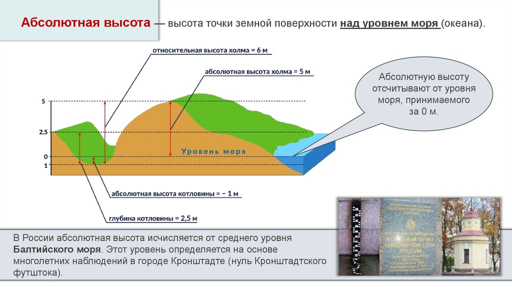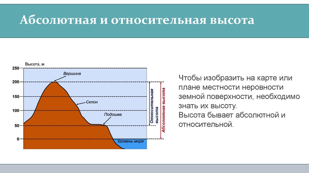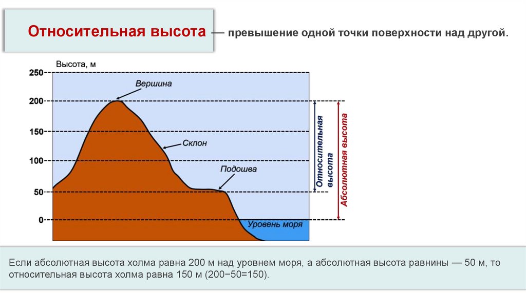 Относительная высота — превышение одной точки поверхности над другой.Если абсолютная высота холма равна 200 м над уровнем моря, а абсолютная высота равнины — 50 м, то