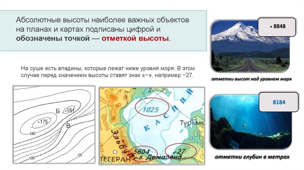 Абсолютные высоты наиболее важных объектовна планах и картах подписаны цифрой и