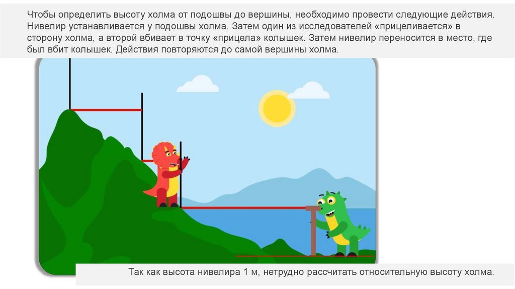 Чтобы определить высоту холма от подошвы до вершины, необходимо провести следующие действия.Нивелир устанавливается у подошвы холма. Затем один из исследователей «прицеливается» в
