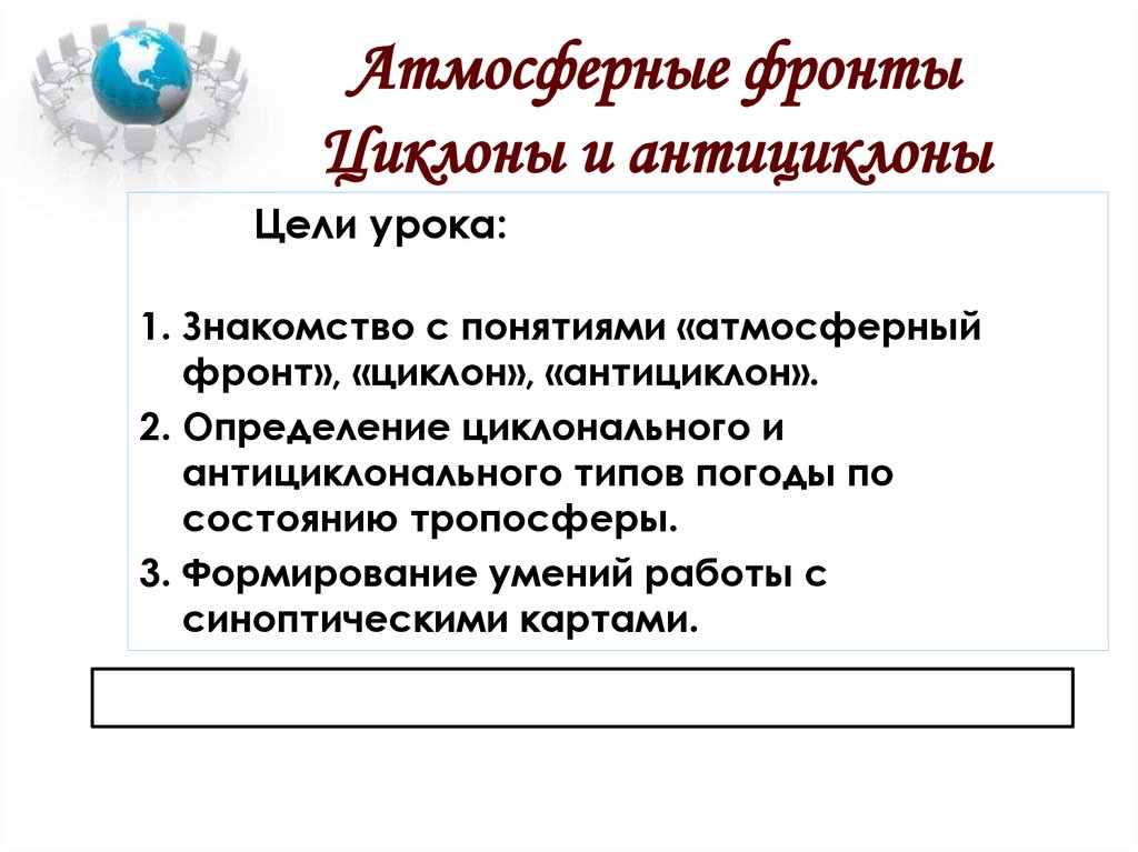 Цели урока:1. Знакомство с понятиями «атмосферный