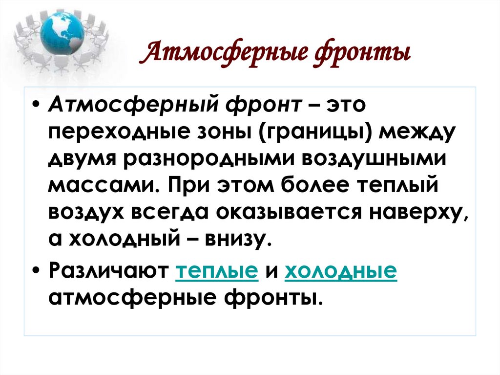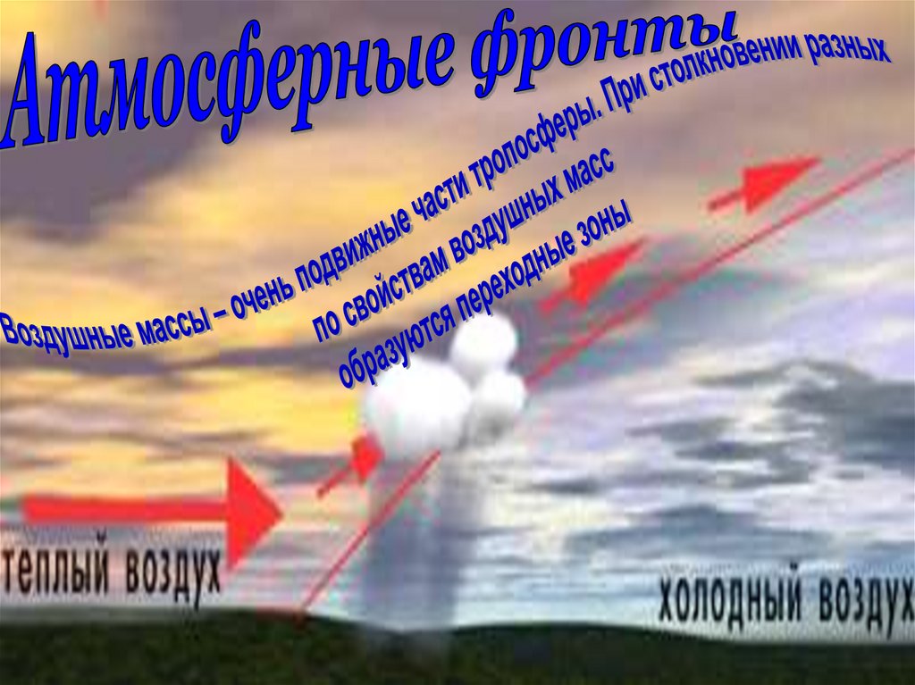 • Атмосферный фронт – этопереходные зоны (границы) между
