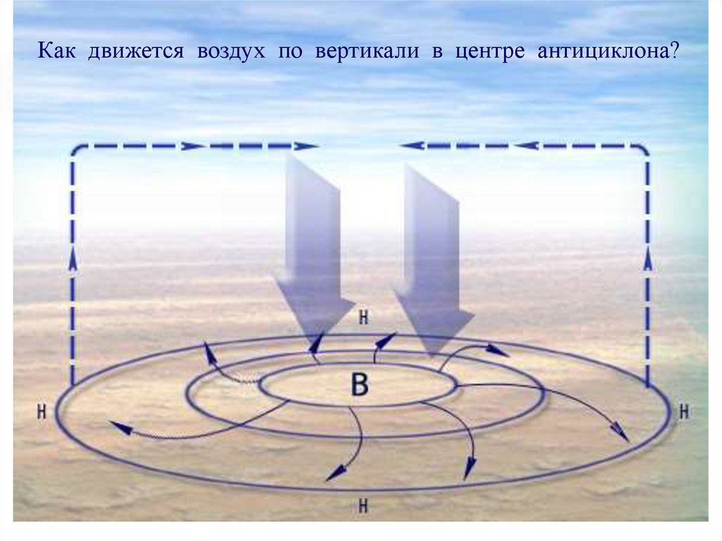 Как движется воздух по вертикали в центре антициклона?АНТИЦИКЛОНЫ