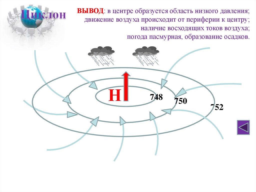 ВЫВОД: в центре образуется область низкого давления;движение воздуха происходит от периферии к центру;