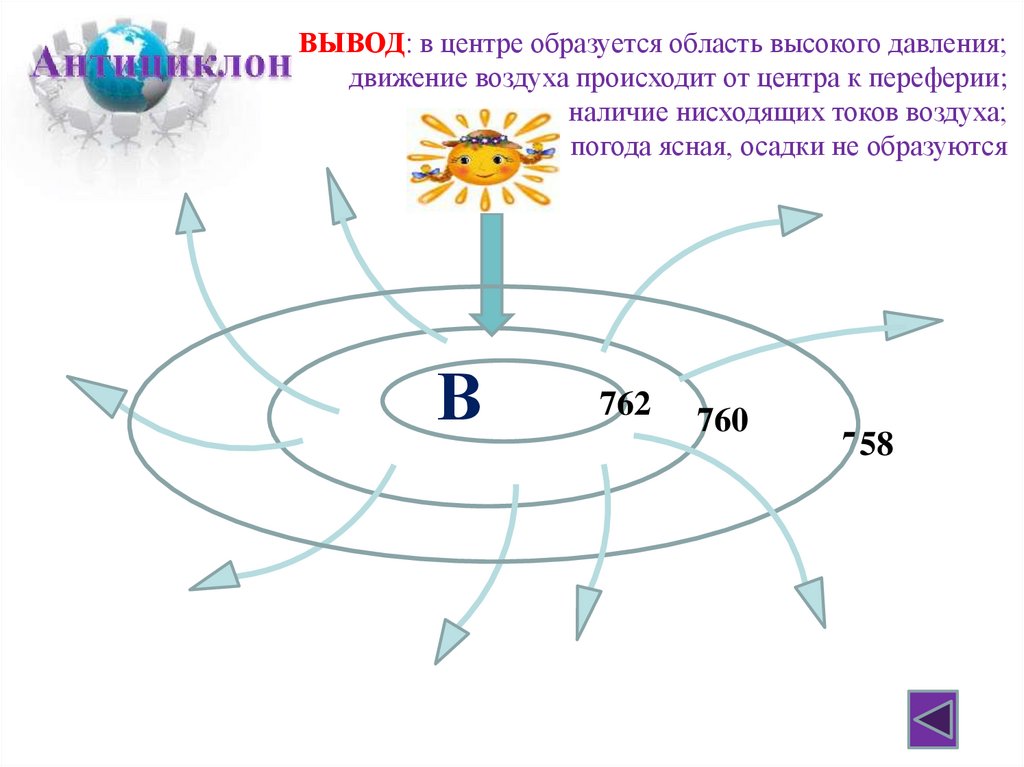 ВЫВОД: в центре образуется область высокого давления;движение воздуха происходит от центра к переферии;