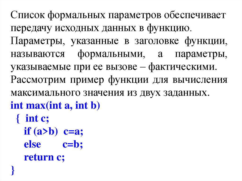 Список формальных параметров обеспечиваетпередачу исходных данных в функцию.