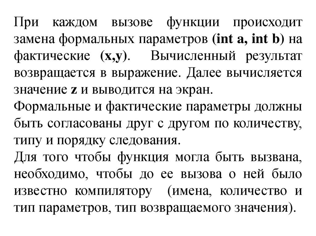 При каждом вызове функции происходитзамена формальных параметров (int a, int b) на