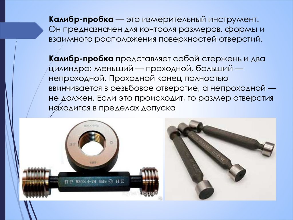 Калибр-пробка — это измерительный инструмент.Он предназначен для контроля размеров, формы и