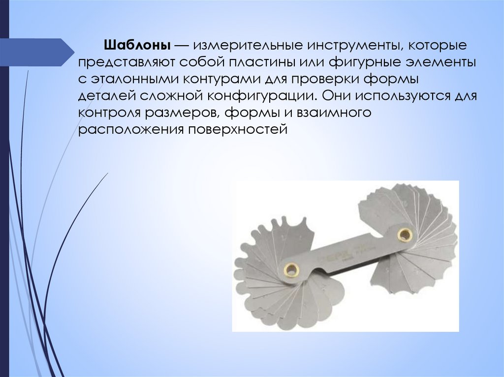 Шаблоны — измерительные инструменты, которыепредставляют собой пластины или фигурные элементы