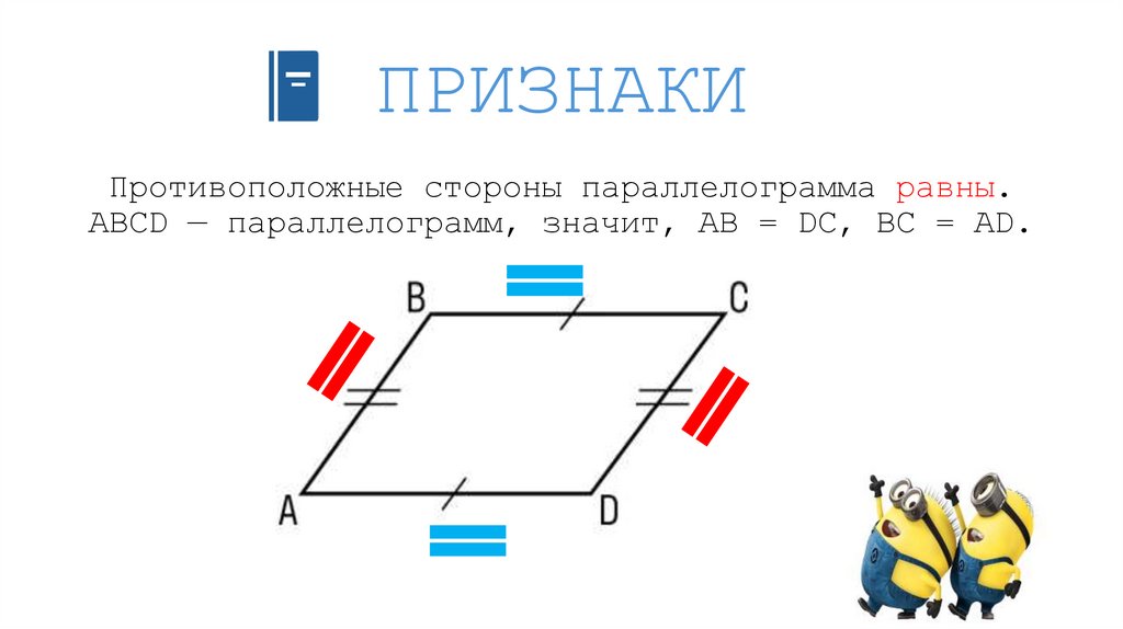Противоположные стороны параллелограмма равны.ABCD — параллелограмм, значит, AB = DC, BC = AD.