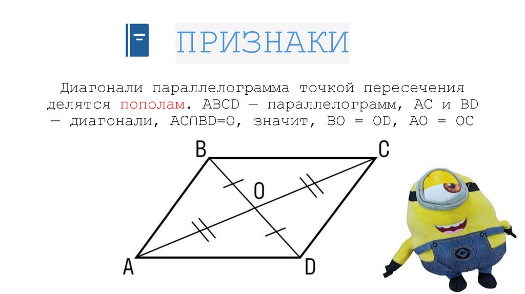 Диагонали параллелограмма точкой пересеченияделятся пополам. ABCD — параллелограмм, AC и BD