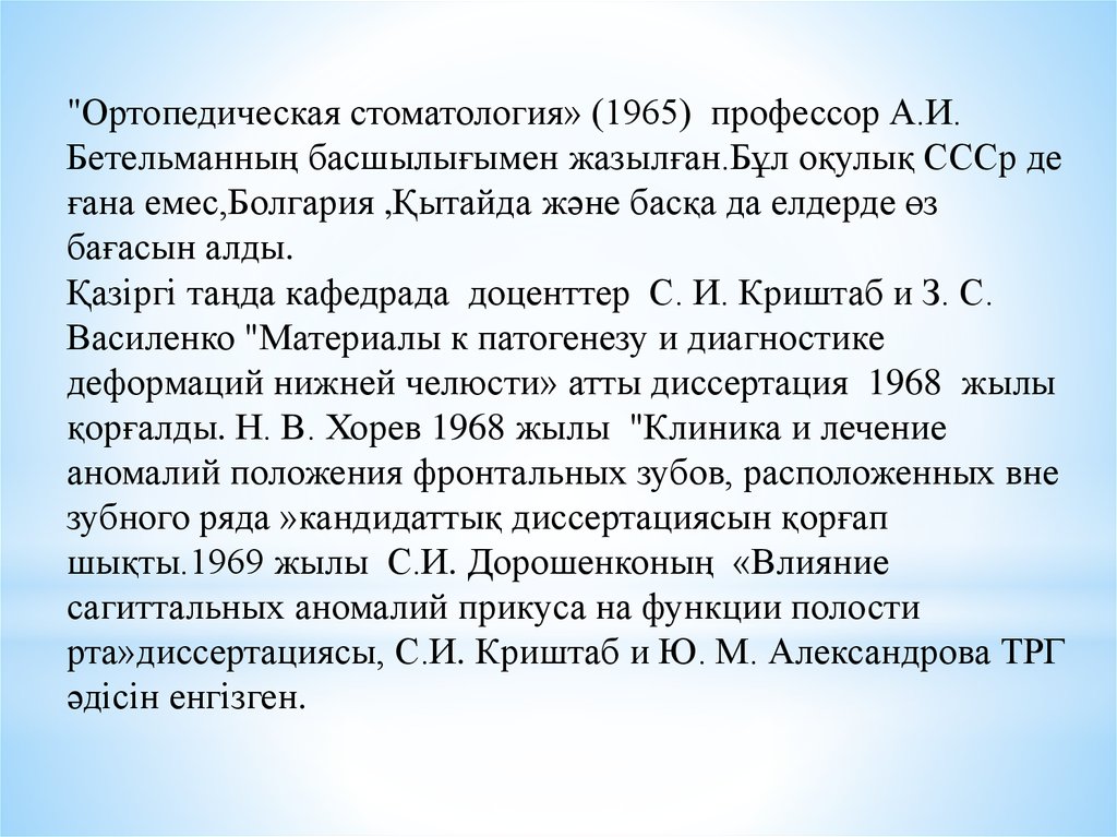"Ортопедическая стоматология» (1965) профессор А.И.Бетельманның басшылығымен жазылған.Бұл оқулық СССр де