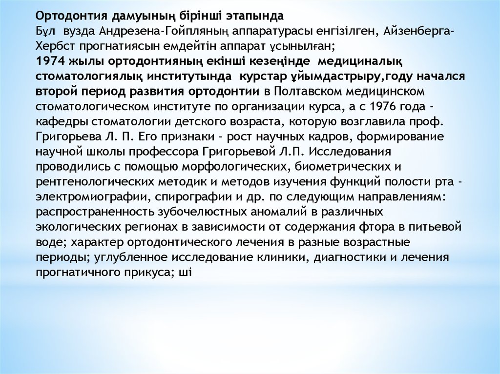 Ортодонтия дамуының бірінші этапындаБұл вузда Андрезена-Гойпляның аппаратурасы енгізілген, АйзенбергаХербст прогнатиясын емдейтін аппарат ұсынылған;