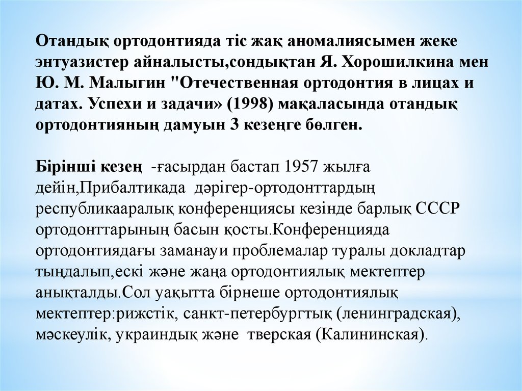 Отандық ортодонтияда тіс жақ аномалиясымен жекеэнтуазистер айналысты,сондықтан Я. Хорошилкина мен
