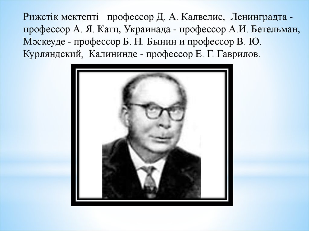 Рижстік мектепті профессор Д. А. Калвелис, Ленинградта профессор А. Я. Катц, Украинада - профессор А.И. Бетельман,Мәскеуде - профессор Б. H. Бынин и профессор В. Ю.