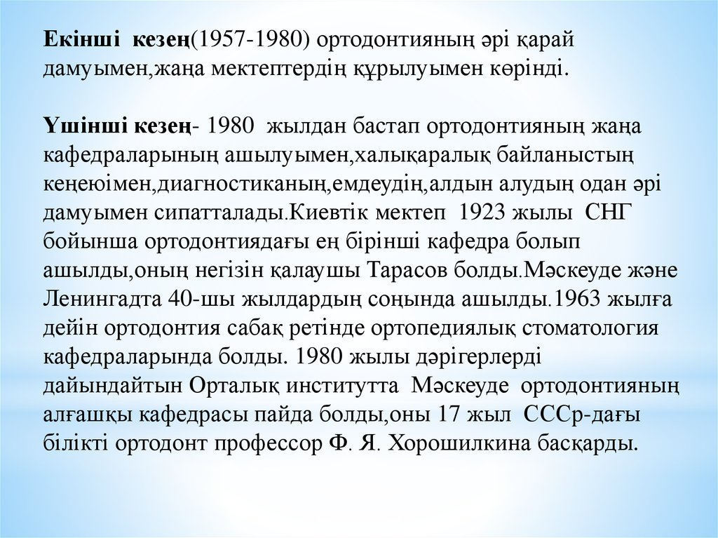 Екінші кезең(1957-1980) ортодонтияның әрі қарайдамуымен,жаңа мектептердің құрылуымен көрінді.