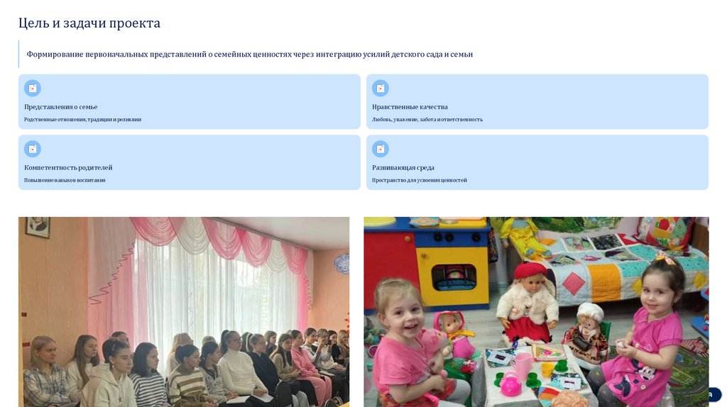 Цель и задачи проектаФормирование первоначальных представлений о семейных ценностях через интеграцию усилий детского сада и семьи