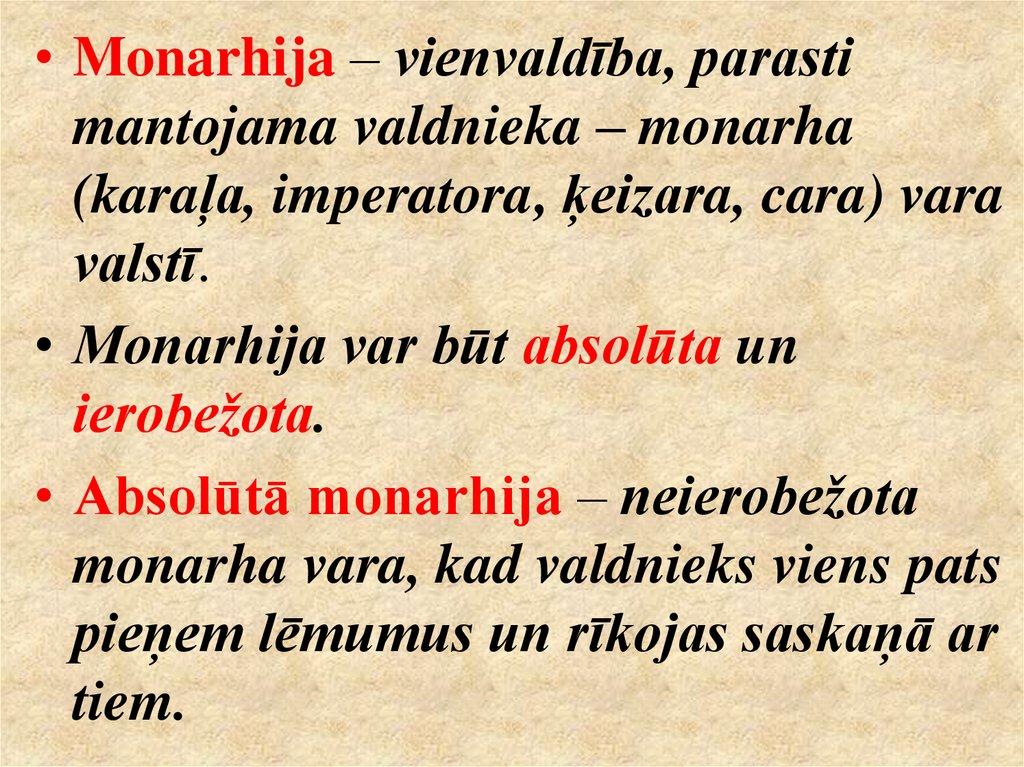 • Monarhija – vienvaldība, parastimantojama valdnieka – monarha