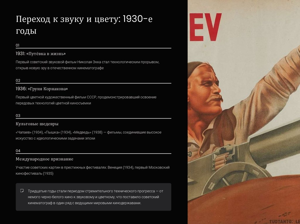 немого черно-белого кино к звуковому и цветному, что поставило советский