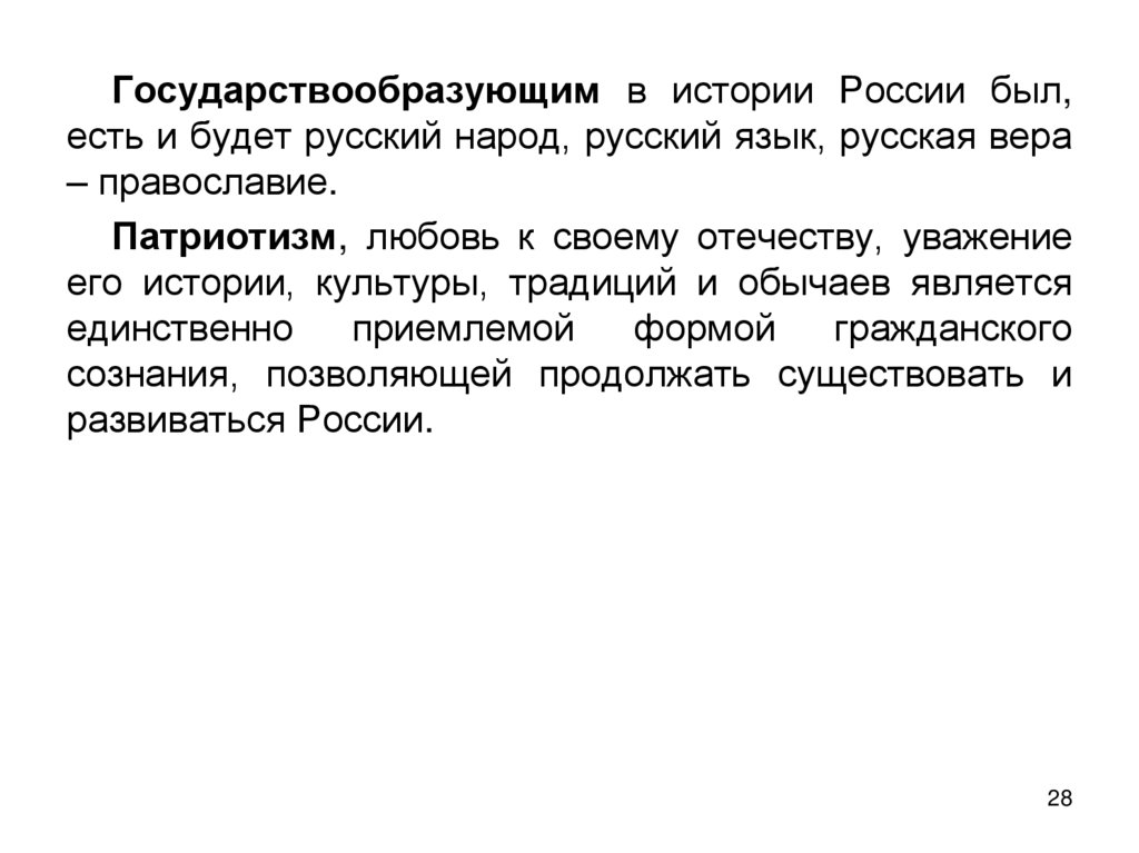 Государствообразующим в истории России был,есть и будет русский народ, русский язык, русская вера