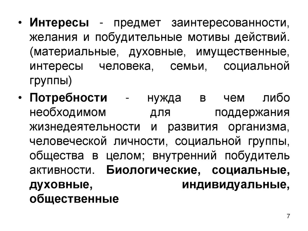 • Интересы - предмет заинтересованности,желания и побудительные мотивы действий.