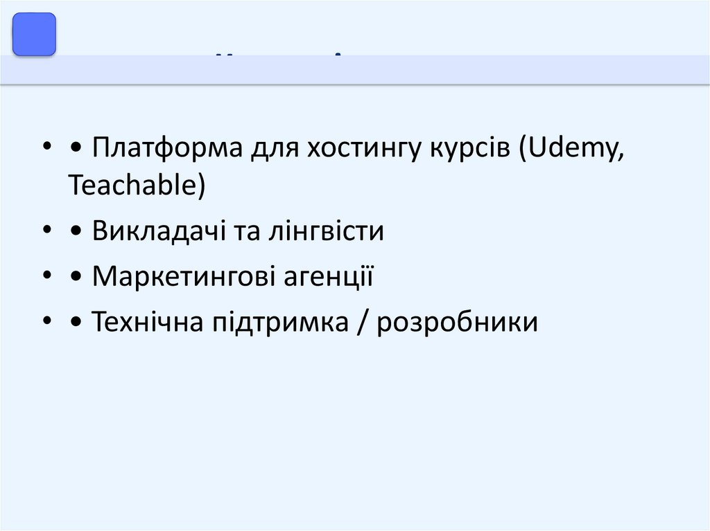 Ключові партнери• • Платформа для хостингу курсів (Udemy,