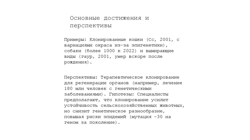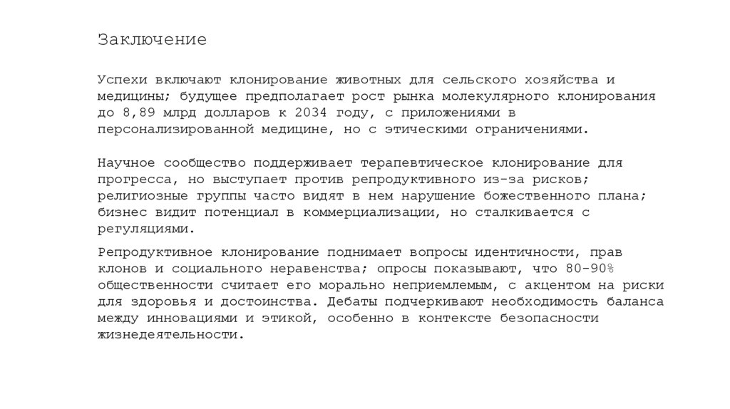 ЗаключениеУспехи включают клонирование животных для сельского хозяйства и