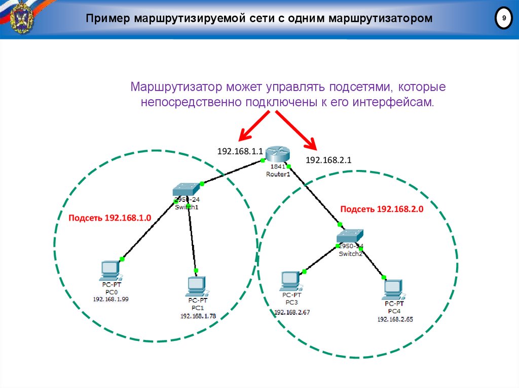 Пример маршрутизируемой сети с одним маршрутизаторомМаршрутизатор может управлять подсетями, которые