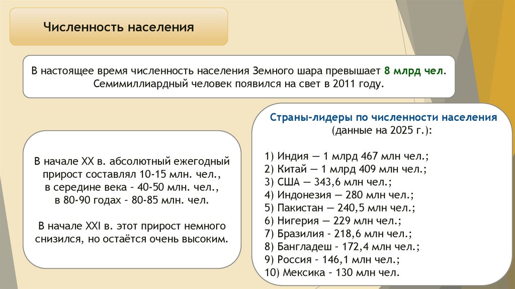Численность населенияВ настоящее время численность населения Земного шара превышает 8 млрд чел.