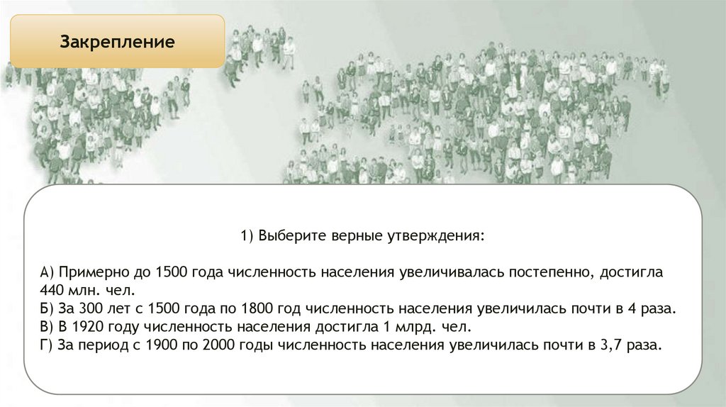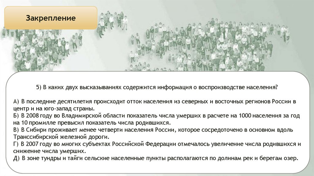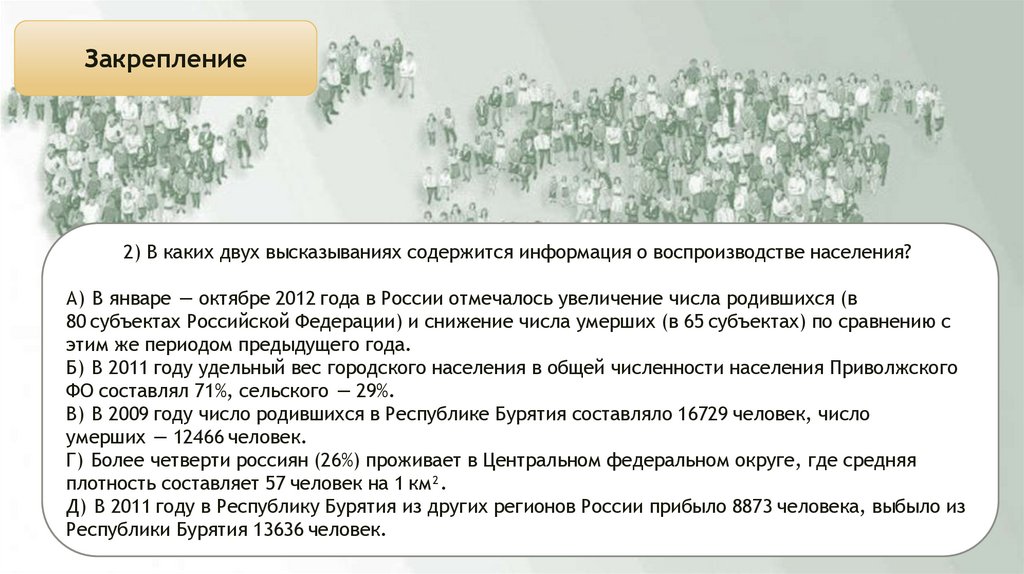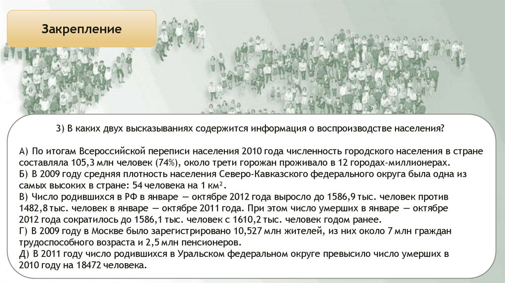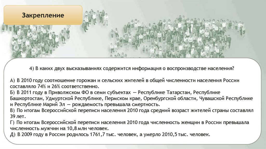 Закрепление4) В каких двух высказываниях содержится информация о воспроизводстве населения?