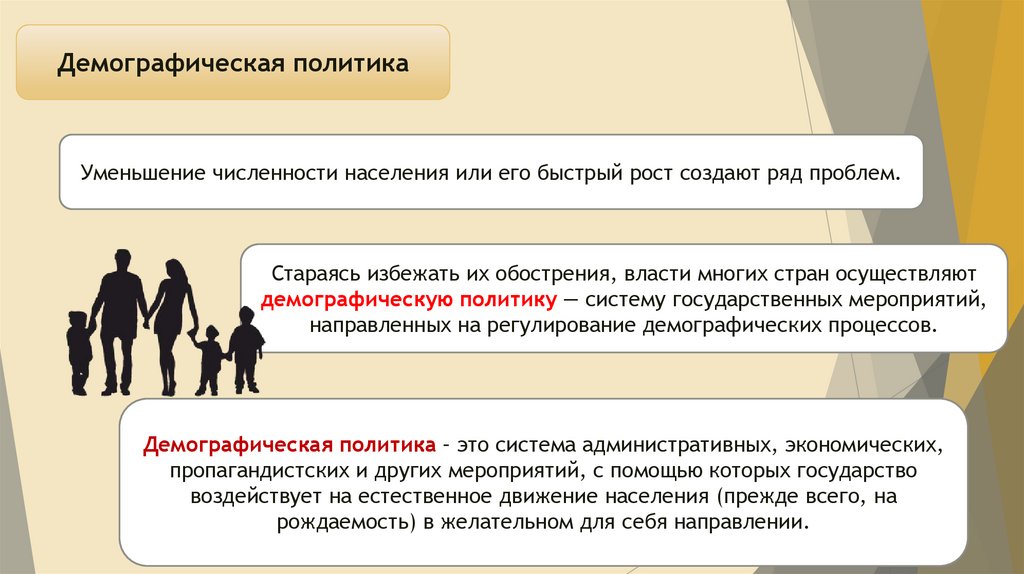 Демографическая политикаУменьшение численности населения или его быстрый рост создают ряд проблем.