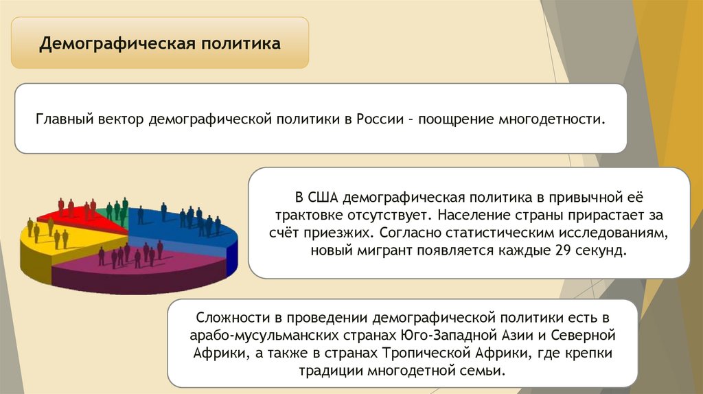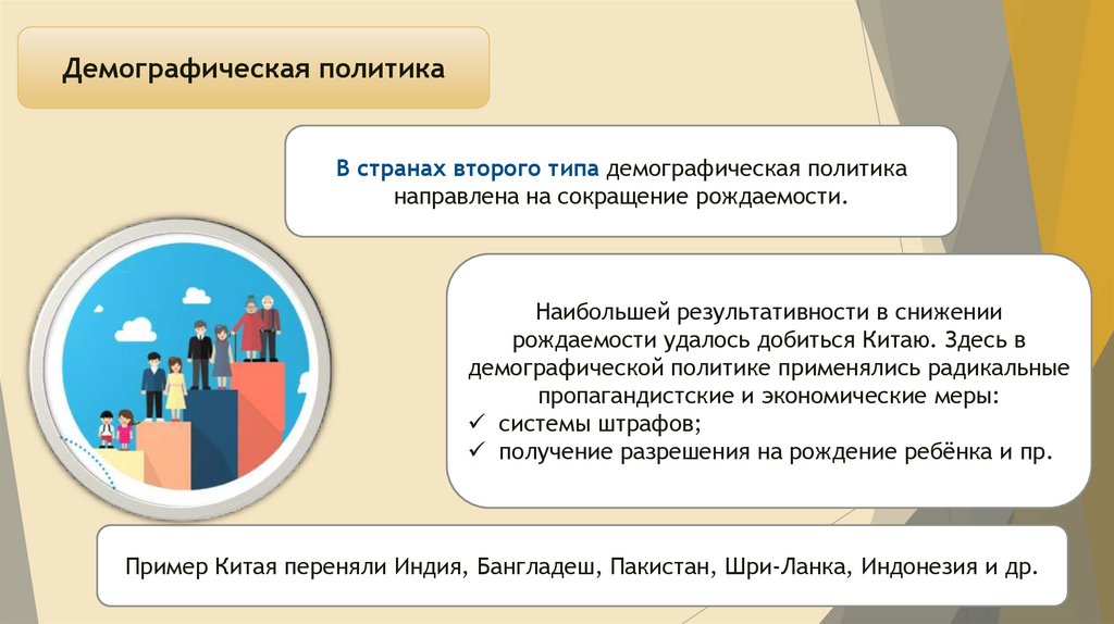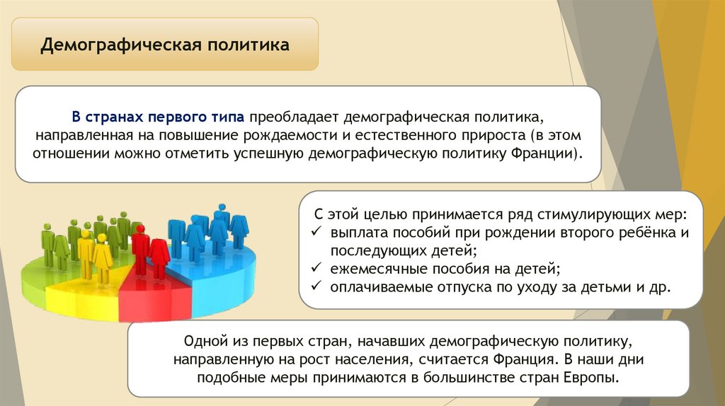 Демографическая политикаВ странах первого типа преобладает демографическая политика,