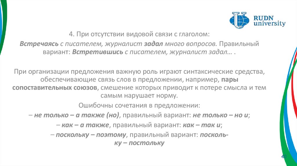 – соблюдение границ предложений, отсутствие излишнего усложнения илиничем не оправданное разделение сложного предложения на простые: Иванов