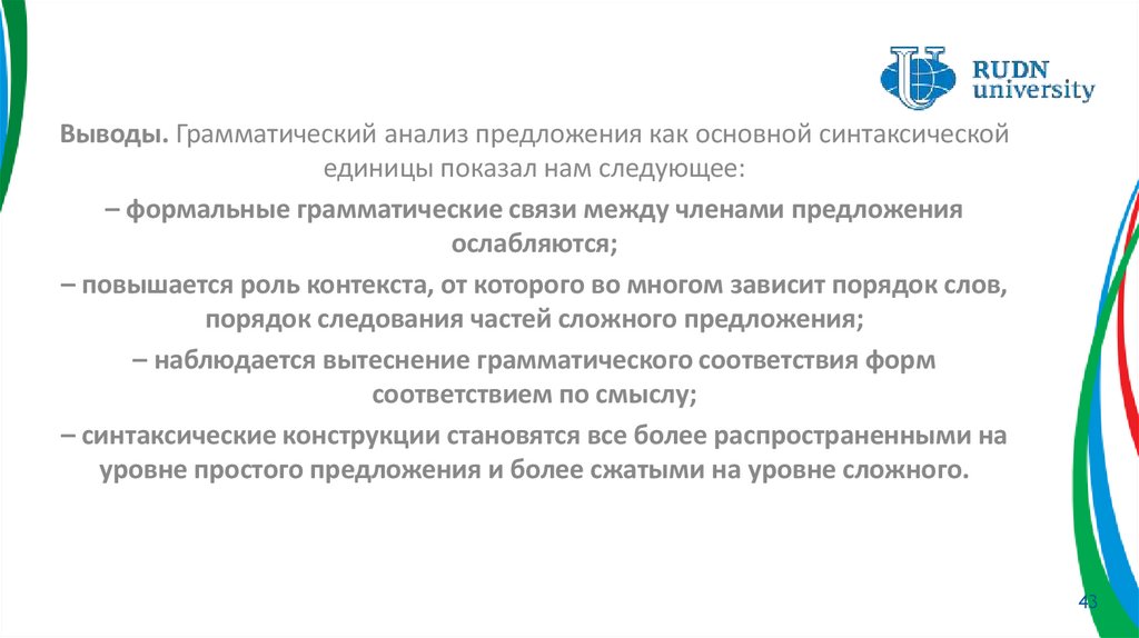 Выводы. Грамматический анализ предложения как основной синтаксическойединицы показал нам следующее: