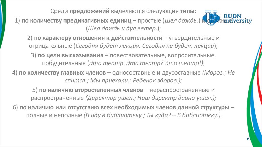Среди предложений выделяются следующие типы:1) по количеству предикативных единиц – простые (Шел дождь.) и сложные