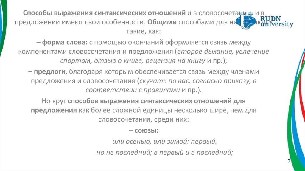 Способы выражения синтаксических отношений и в словосочетании, и впредложении имеют свои особенности. Общими способами для них являются