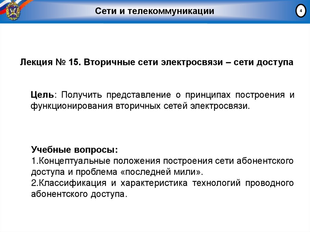 Сети и телекоммуникацииЛекция № 15. Вторичные сети электросвязи – сети доступа