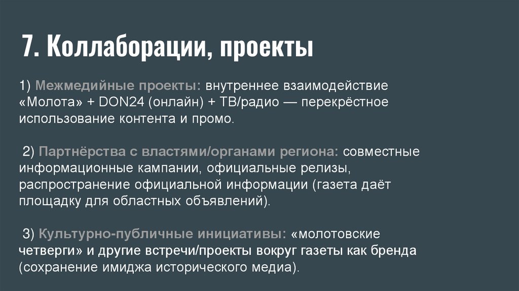 7. Коллаборации, проекты1) Межмедийные проекты: внутреннее взаимодействие