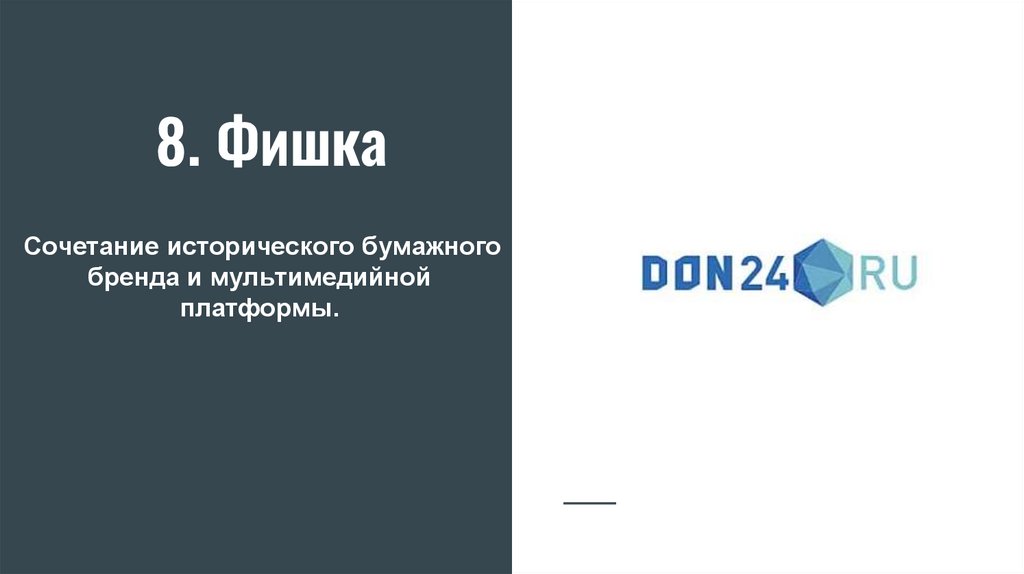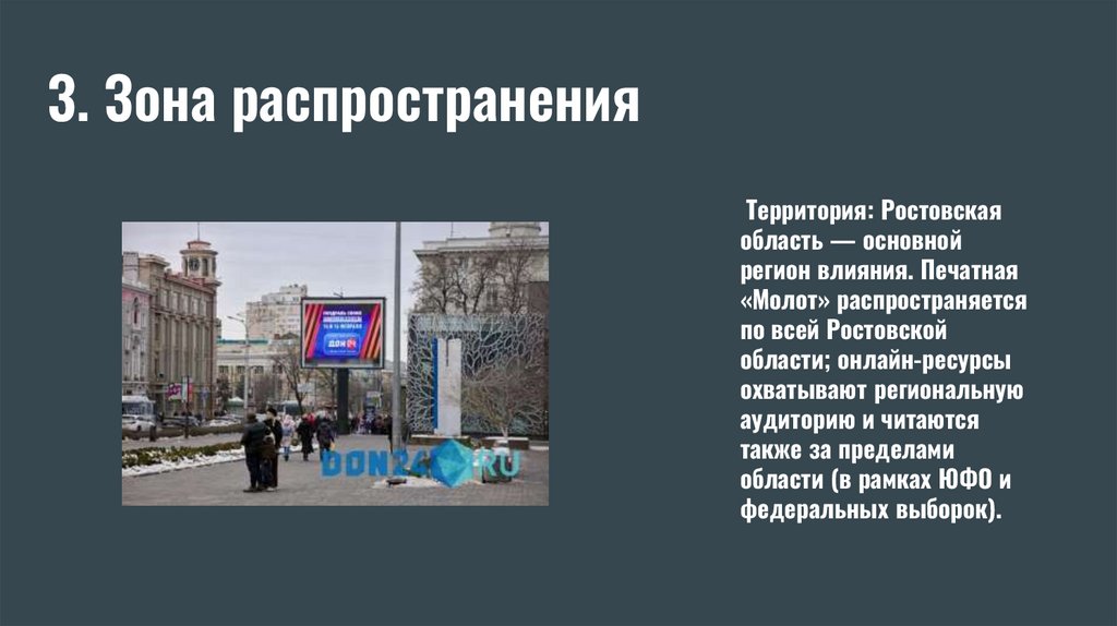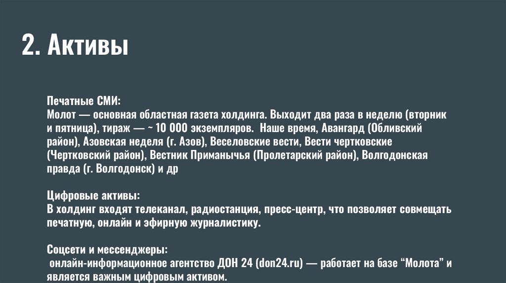 контента в разных форматах: традиционная печать (областная газета), онлайнновости (дон24), телевизионный и радиоконтент, PR/ивенты. Концепция — быть