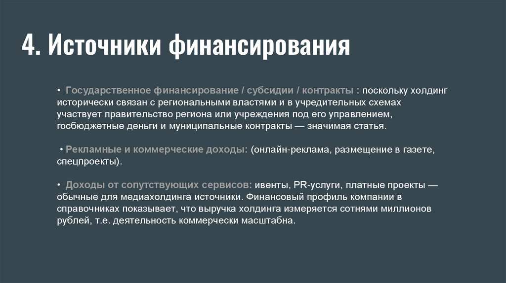 4. Источники финансирования• Государственное финансирование / субсидии / контракты : поскольку холдинг