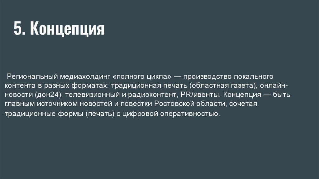 5. КонцепцияРегиональный медиахолдинг «полного цикла» — производство локального