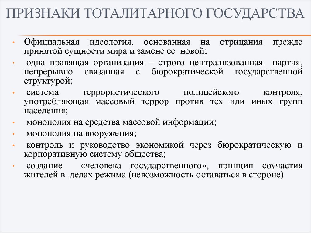 ПРИЗНАКИ ТОТАЛИТАРНОГО ГОСУДАРСТВАОфициальная идеология, основанная на отрицания прежде