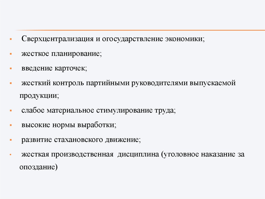 Сверхцентрализация и огосударствление экономики;жесткое планирование;