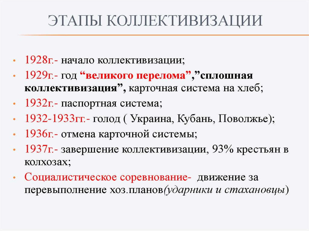 ЭТАПЫ КОЛЛЕКТИВИЗАЦИИ1928г.- начало коллективизации;