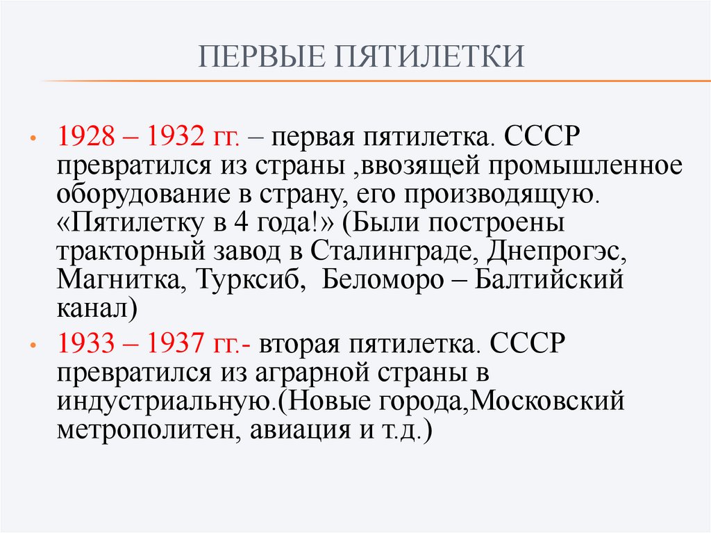 ПЕРВЫЕ ПЯТИЛЕТКИ1928 – 1932 гг. – первая пятилетка. СССР