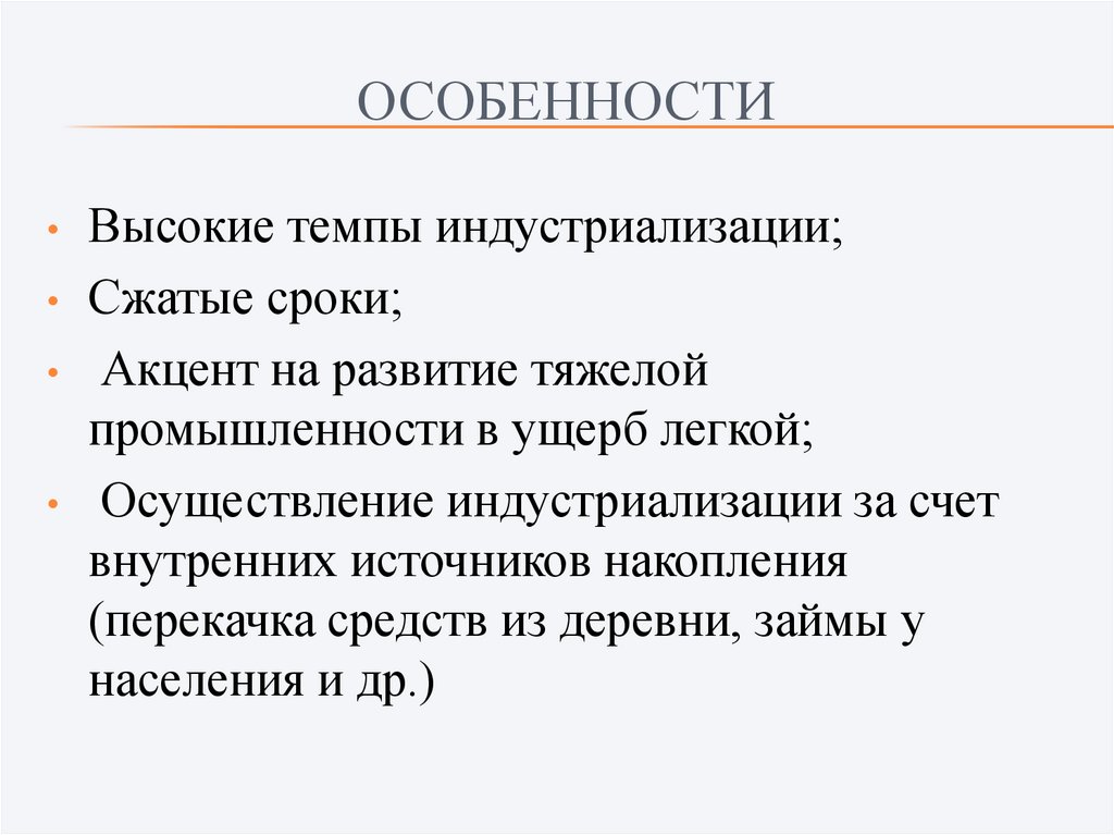 ОСОБЕННОСТИВысокие темпы индустриализации;