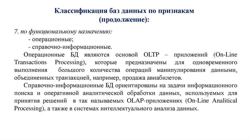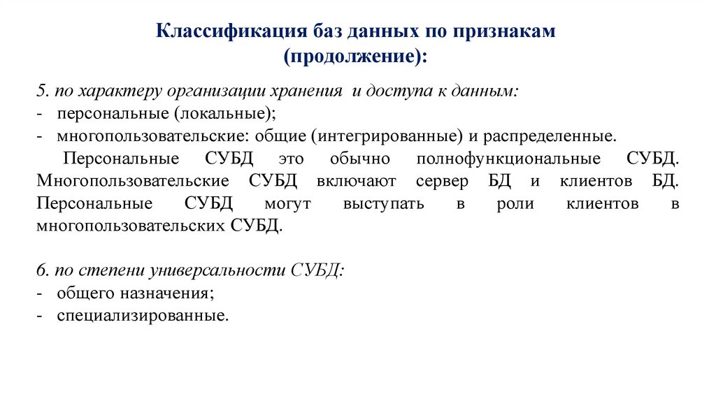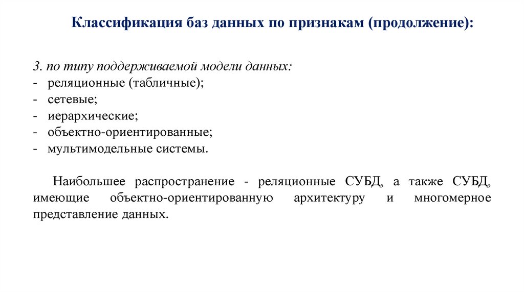 Классификация баз данных по признакам (продолжение):3. по типу поддерживаемой модели данных: