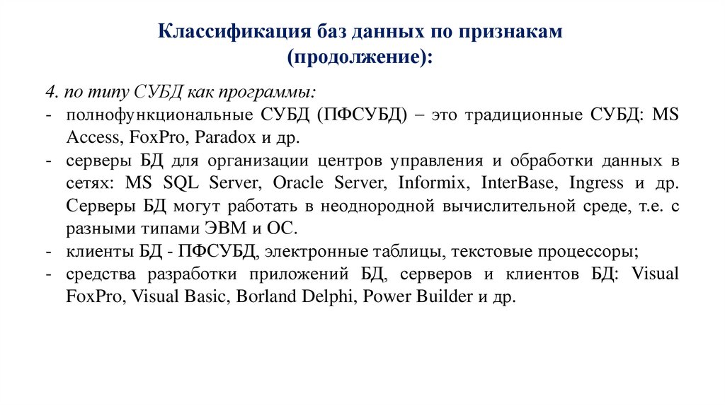 - полнофункциональные СУБД (ПФСУБД) – это традиционные СУБД: MS